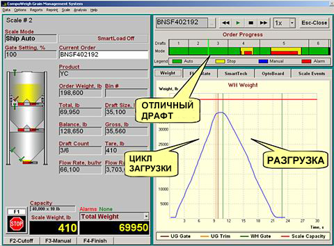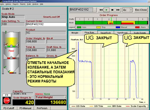 (Заметьте, что начальный импульс/скачок в потоке, - это удар первого зерна в потоке дна весовой цистерны. Это абсолютно нормально до тех пор, пока поток выровняется после скачка )